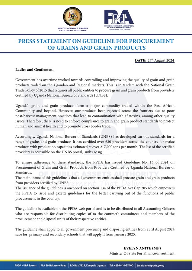 Press Release on Purchase of Grain and Grain Products August 30, 2024 2:55 pm Published by Abraham Download Download is available until [expire_date] Version Download 56 File Size 126.14 KB File Count 1 Create Date 30th August 2024 Last Updated 14th August 2025 Press Release on Purchase of Grain and Grain Products @tgcuganda